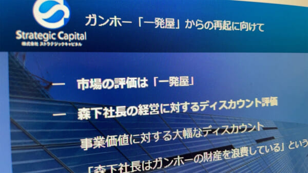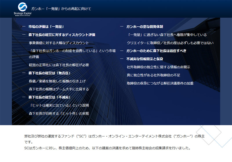 ゲーム会社ガンホー・オンライン・エンターテイメントをめぐり、投資ファンドの株式会社ストラテジックキャピタル(SC)が8月27日、臨時株主総会を前に特設サイトを開設し、取締役会や森下一喜社長への強い批判を一般公開しました。