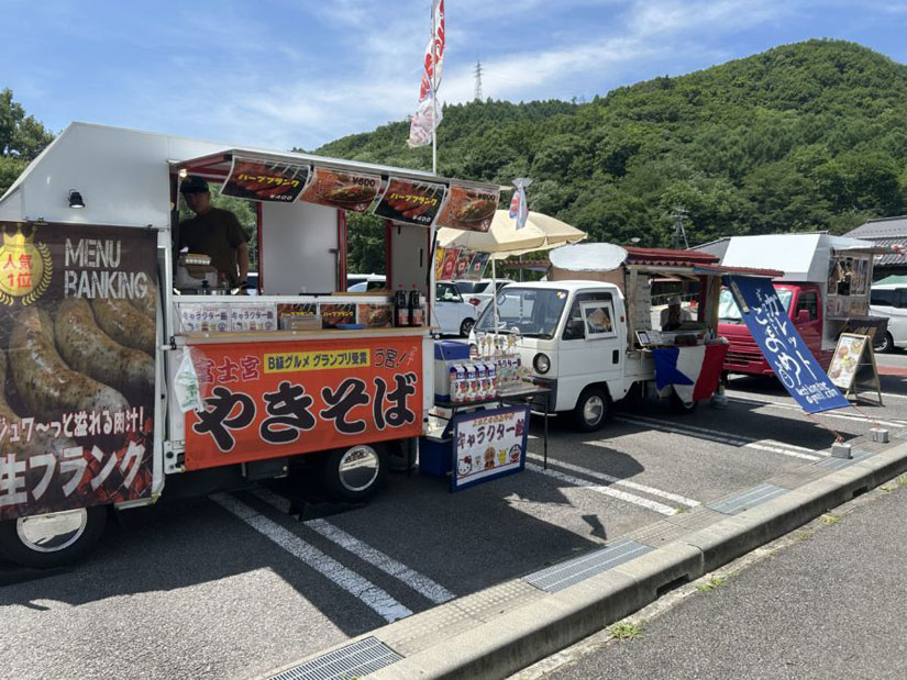 マルシェイベント会場は入場無料。温泉施設の玄関前を会場に、タコス・タイ料理などのキッチンカー、生わらびもち・おやき・焼き菓子などの飲食店や、クラフト・ワークショップブースなど約22店が集結するほか、「ケアポートみまき」の野菜も販売。
