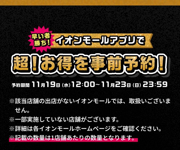 数量限定の特別特典をイオンモールアプリから事前予約できるそうです。