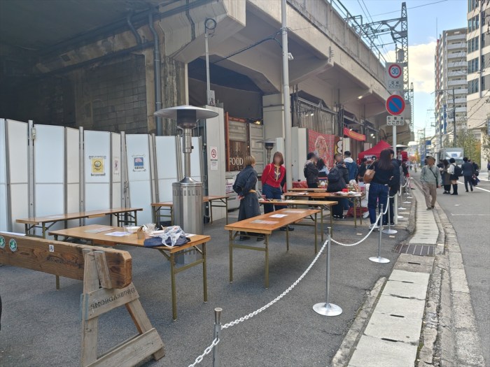 阪急電鉄の高架下に作られた半屋内のイベントスペースで、雨風を気にせず過ごせるうえ、スロープ完備でバリアフリー。剥き出しの高架コンクリートが、都会的な雰囲気を漂わせるオシャレな場所だった。