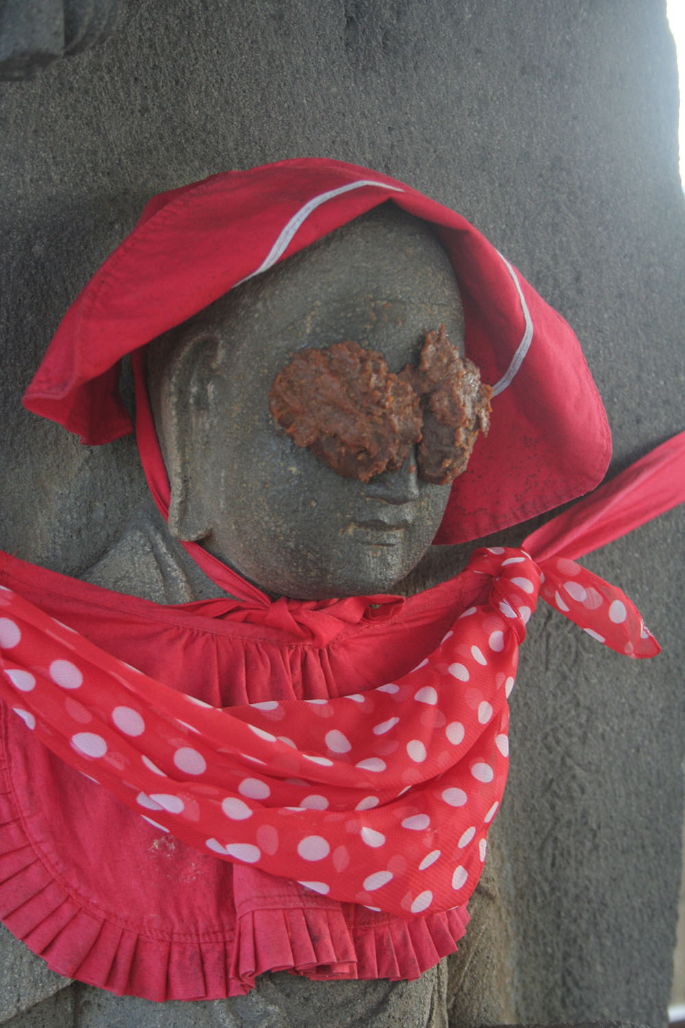 せっかくなので塗ってみた。素手で味噌をたっぷり掴(つか)んで地蔵の両目に盛ると、味噌のにおいが漂う。きれいに盛れるよう微修整しているうちに、陶芸家か彫刻家の気分になってきて、目疾地蔵にどんどん愛着が湧いてきた。毎年、子供たちがお地蔵さんに色を塗る化粧地蔵もそうだが、仏像になにか手を加えると、一気にこの世とあの世が地続きになる気がする。