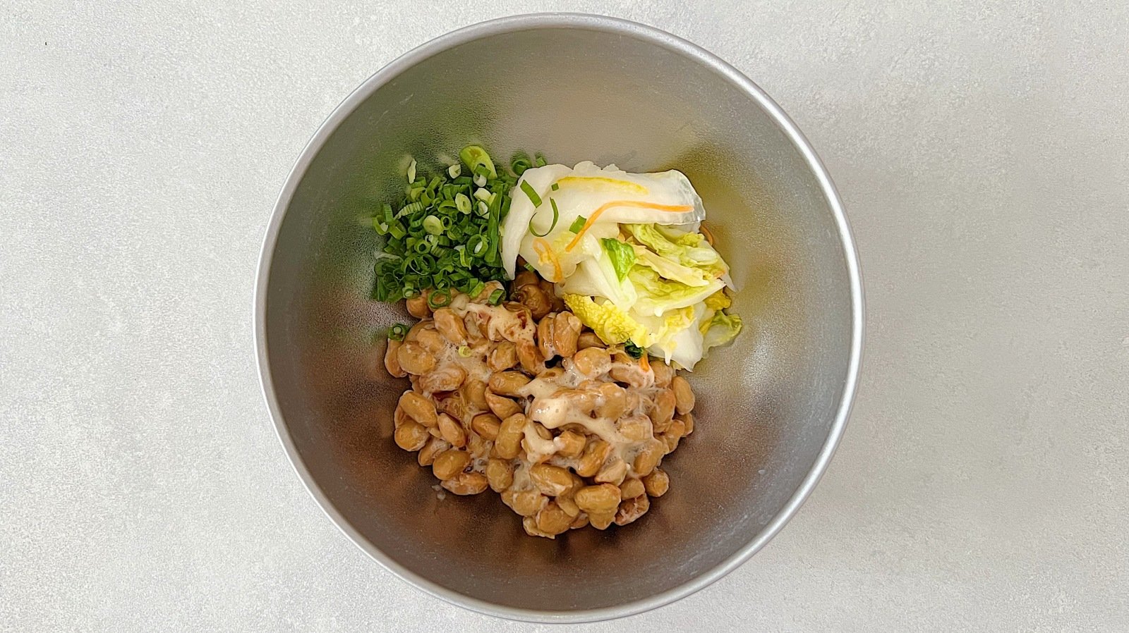 2 ボウルに1の納豆、ゆず白菜、めんつゆ、小ねぎを入れてよく混ぜ合わせる。