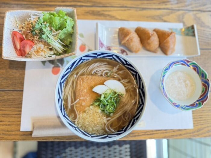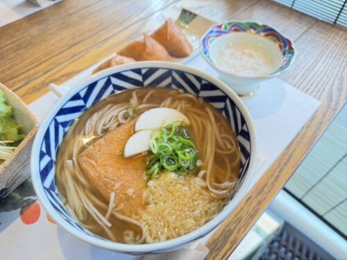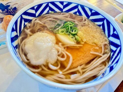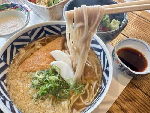麺は平麺です。お話を聞くと 「いろんな麺試したけど、これが好きだ!と思ったから」 だそうで、そばをすすった時にお出汁の鰹風味がふわっと広がります。 かけそばが出てくるかと思ったら、きつねそばが出てきたところも◎。
