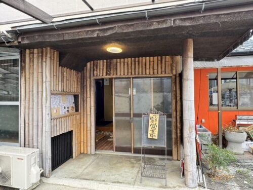 看板に「サラザン」の文字とそば処の幟(のぼり)が立っています。