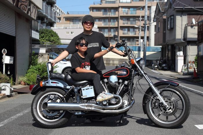 これまで何度か本誌に登場している相楽さんだが、今回はたっての希望で愛息の一誠君とご登場。写真のロボヘッドローライダーはサンダンスZAK柴崎氏の最初の愛車であるショベルFXSをモチーフに製作されたもので、ソフテイルをベースに