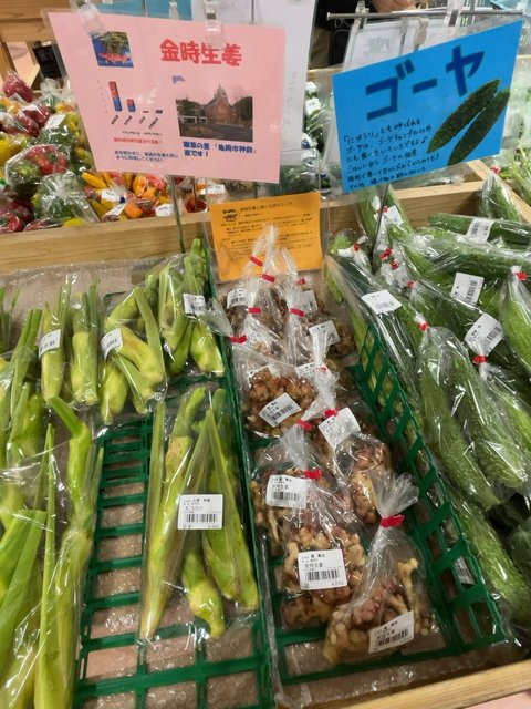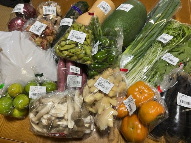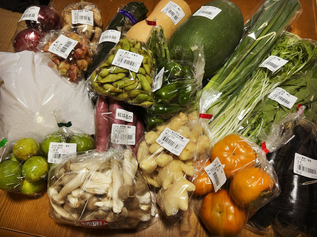 今回の戦利品はこちら。紹介した野菜をはじめ、西日本中心に栽培されている品種『ヒノヒカリ』の地元産玄米も購入。