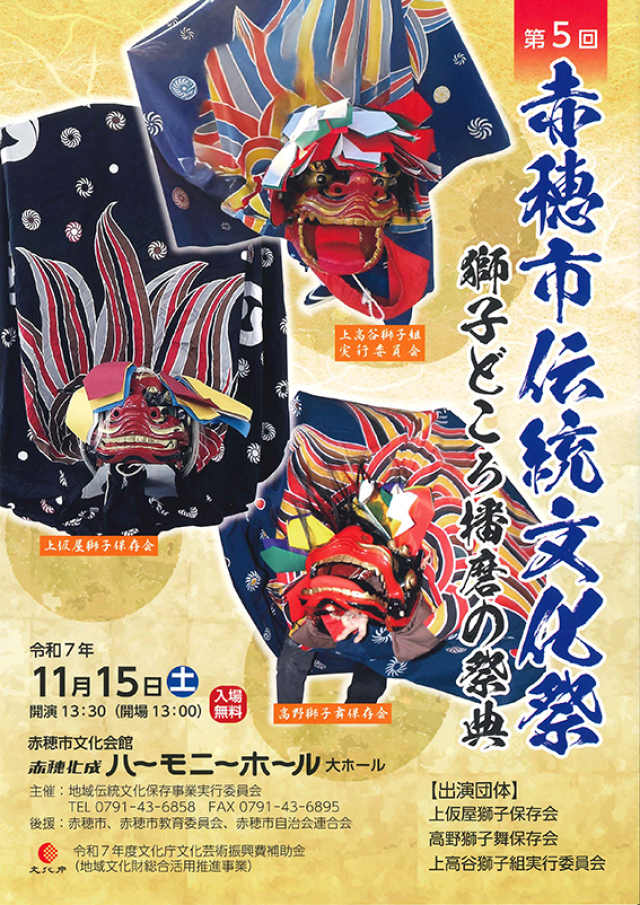 赤穂市内各地域で獅子舞を伝承する団体が日頃の練習成果を披露する赤穂市伝統文化祭が11月15日(土)、中広の赤穂化成ハーモニーホールで開催される。