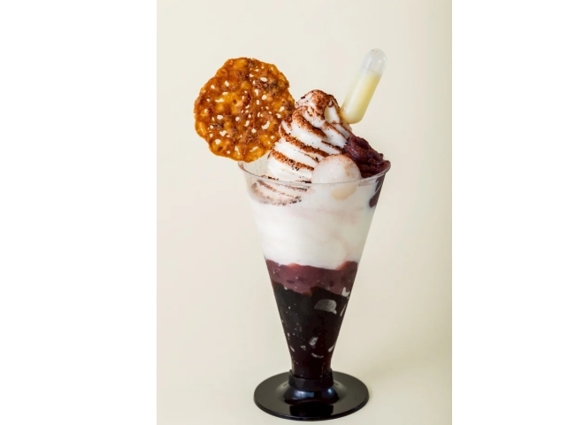 クリームチーズが口いっぱいに広がるソフトクリームの下には、円山にある『斎藤珈琲』が焙煎したオリジナルブレンドをコーヒーゼリーにし、北海道十勝産小豆を使った粒あん、白玉が隠れています。スポイトで添えられた練乳ソースをかけて召し上がれ!