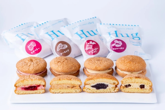 新商品『Hug』は、ふんわりしっとりした軽やかな生地で様々なクリームや素材をぎゅっと包み込んだパフケーキサンド。『ラズベリー』『アーモンド』『あんこバターソルト』『ラムレーズン』の4種類が登場します。