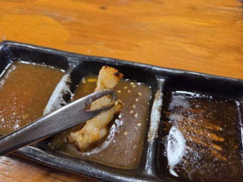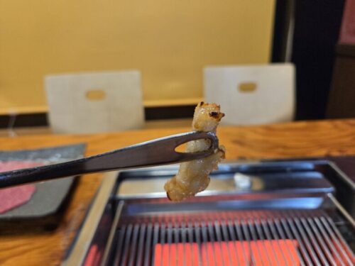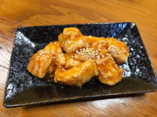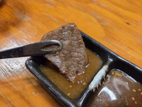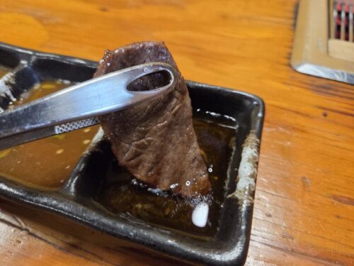 こちらは醤油タレへ。 赤身が多く、脂の少ないのが特徴のランプ。脂っぽさが少ない分、噛みしめるほど肉の旨味を感じられます! そこに醤油タレが絡み、旨味倍増!ヘルシーとジューシーを両立した肉ですね。 最後はシマチョウ。