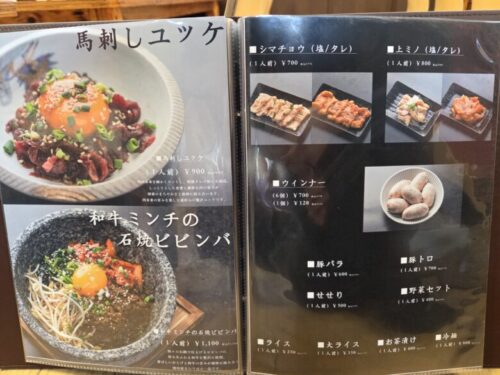 黒毛和牛のロース、カルビなどの定番お肉からイチボといった希少部位、シマチョウや豚バラに盛り合わせ、ユッケやビビンバなど豊富なメニューの数々。 それにしても…肉綺麗すぎん?!実際にお肉を見せてもらいました。