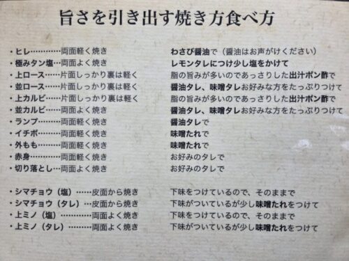 なんと!全部位ごとの焼き方と食べ方が書かれてる! 焼くのが苦手、正直どのタレで食べていいか分からん、そんな方には嬉しいサービスです。 これは焼き方下手ッピな私でも良い感じに焼けそう! 焼き方も確認できたところで注文します。