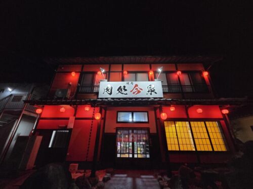 右側に赤い建物が見えてきます。こちらが「肉処 今泉」です。 店内へ入ります。