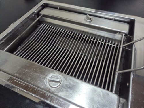 こちらは無煙ロースターと呼ばれ、網の部分が実はパイプになっており、ここに両サイドのタンクから水が流れる仕組み。これによりパイプの温度が極端に高温になりにくく、焦げ付きにくいのが特徴です。また、遠赤外線で肉を焼くことに加え、網の下にも水が溜められており、肉から落ちる油が水に落ちることで油のべたつきにくさ、煙の発生を防ぐといった利点があります。 これ1台で焦げ、煙、油のべたつきといった3大お悩みを解決してしまうなんて! 無煙ロースター、恐るべし!