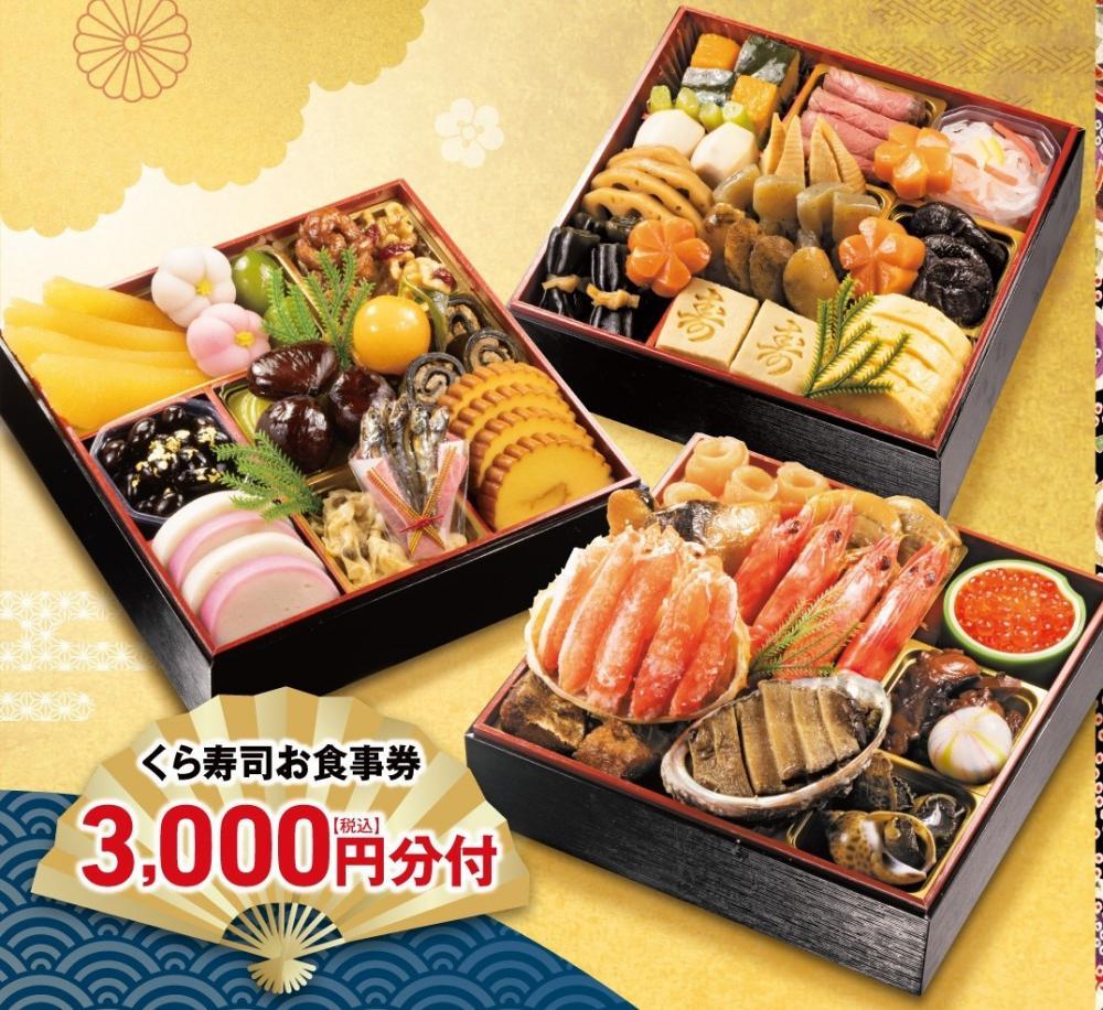このおせちは3人で食べるのにちょうど良いサイズ。くら寿司の食事券2000円分も付いています。冷凍商品でありながら、味のクオリティが高いと毎年評判。おせち選びを失敗したくない人におすすめです。