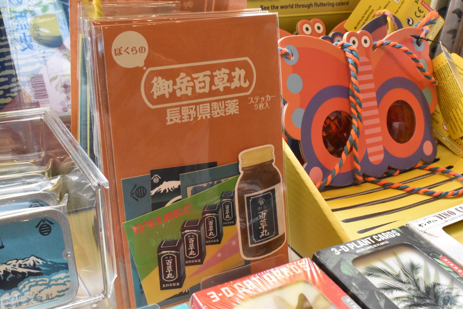 ink stainは4坪ととても店内は狭い。そして写真のような昭和な「かるた」や、地元の薬のロゴのついたた商品、海外向けのおしゃれな筆ペンといった、振れ幅の広い文房具がギュッと相当な密度で並んでいる。