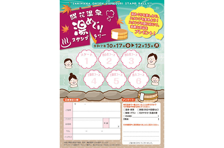 参加する6つの宿でスタンプを集めると、数に応じて素敵な景品がもらえます。この機会に、ぜひ咲花温泉へ。