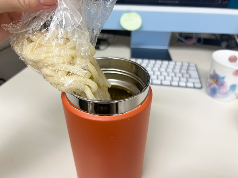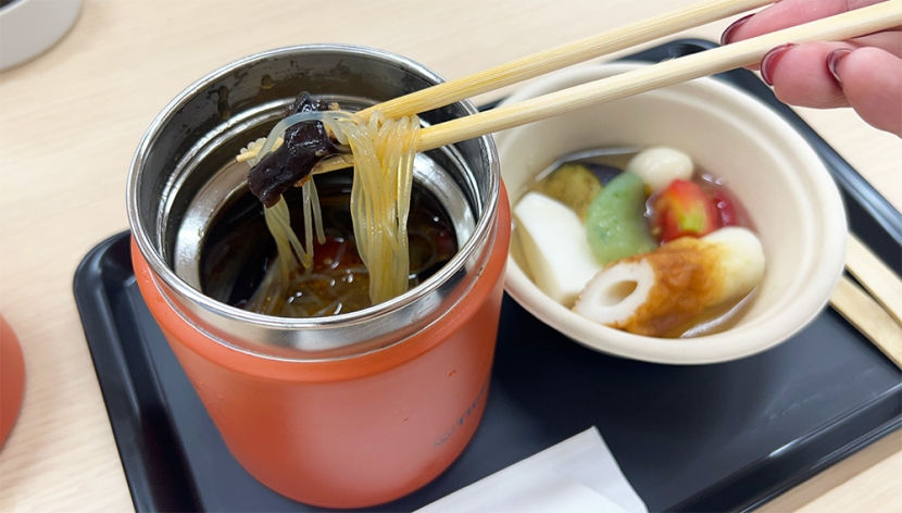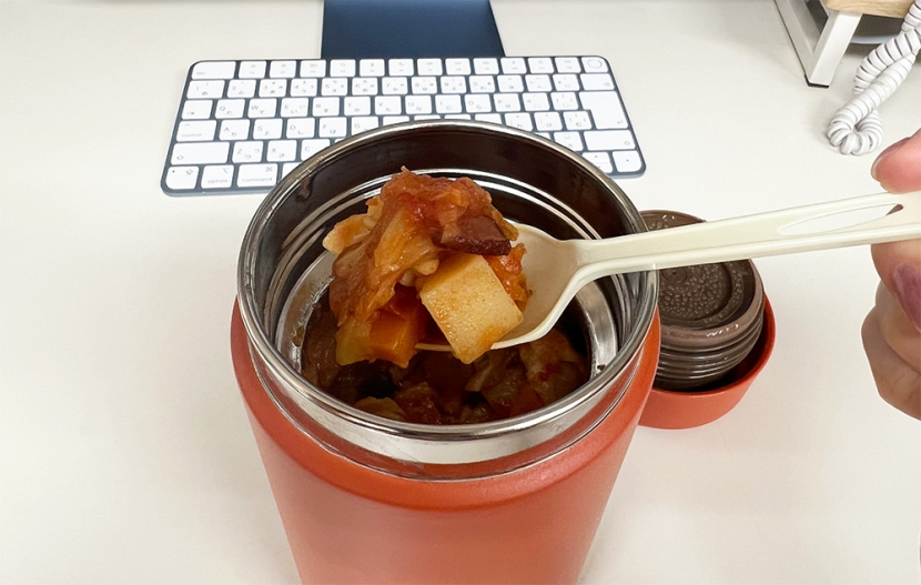 「カレースープを7割ほど入れたジャーに、電子レンジで温めた冷凍うどんを投入して食べたところ、すごくおいしくいただけました。カレーうどんをお弁当にできることはあまりないので、かなり重宝しそうです」と嬉しそう。少し気になったのは、お箸とフードジャーの形の相性だそうで「中でお箸を開くことが難しいので、別の器に移し替えたり、長くてすべりにくいスプーンやフォークを使ったりすると快適に食べられそうです」とのことでした。