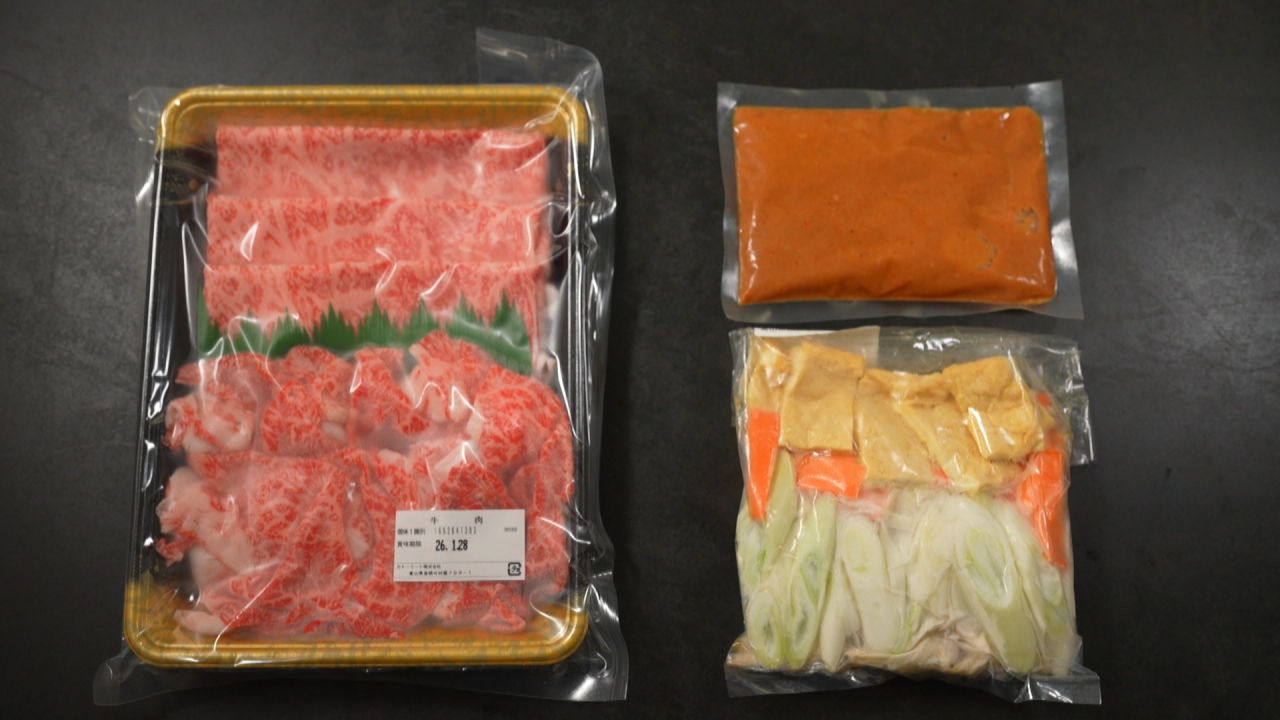 最高級A5ランクの「とやま和牛」が360g。およそ4人前の肉と、味噌ベースのスープ、ごぼうや油揚げ、ねぎ、にんじんといった鍋野菜がセットになった商品です。