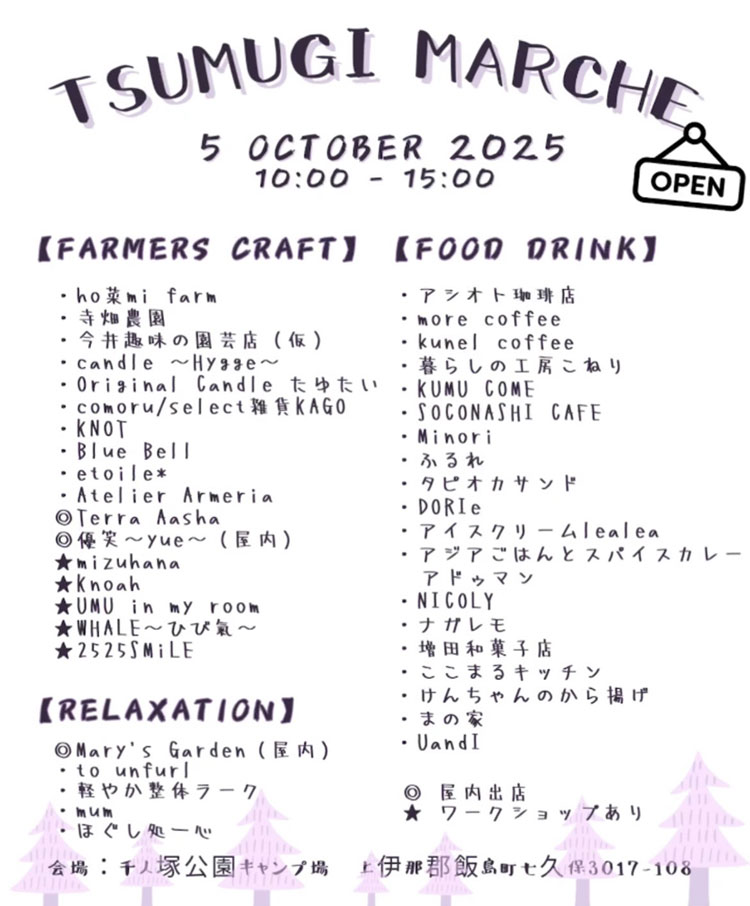 10/5(日)ちょっぴり早いハロウィン♪『つむぎマルシェ』開催!今月は41ブースが集結!仮装して来場するとお菓子プレゼントも@長野県 飯島町