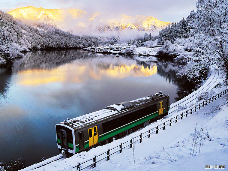 夜の帳が溶け、峡谷に薄明の光が満ちてくる。凍てつく空気を裂いて列車が静かに軋みを響かせてやってくる。霊峰は一夜にして白金の衣をまとい水鏡は天空の光芒を映している。山稜が金色に燃え立つと、その輝きは湖面に反射して、列車を淡く照らしてくる。