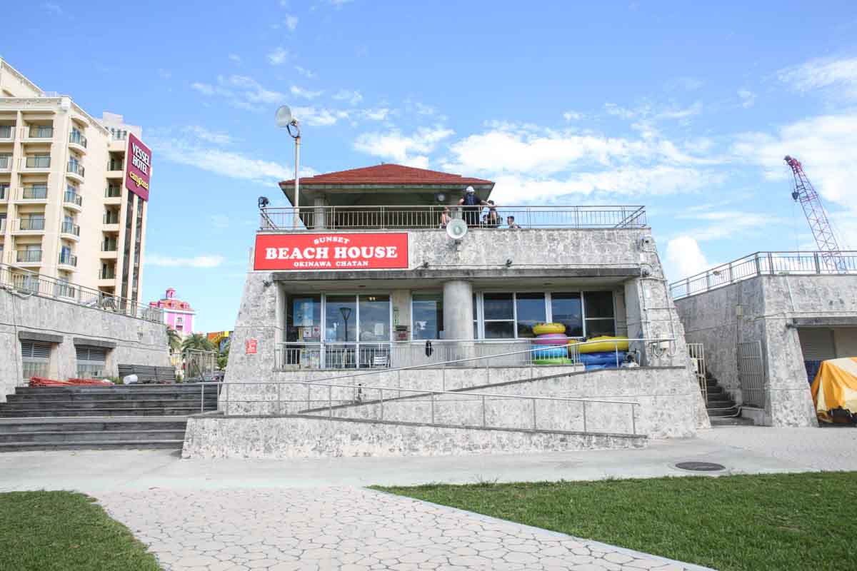 サンセットビーチの管理事務所(BEACH HOUSE)は、美浜アメリカンビレッジ側にあります。 売店も兼ねており、浮き輪やゴーグル、日焼け止めなどのビーチレジャー用品が販売されているほか、浮き輪やバレーボール、パラソル&ビーチチェアなどをレンタルすることもできます。