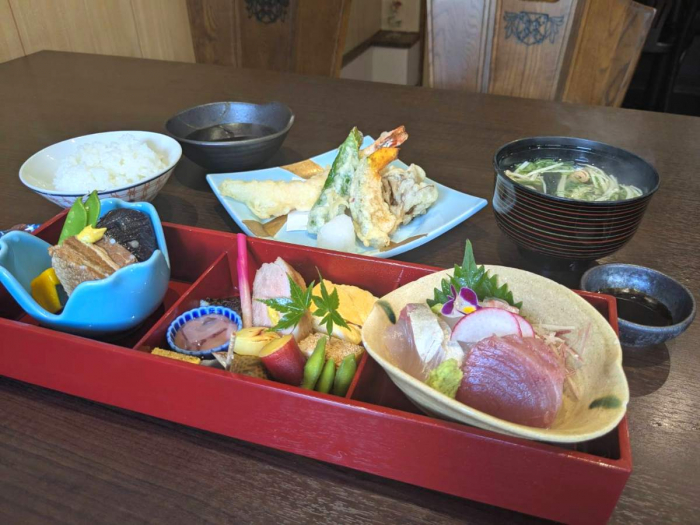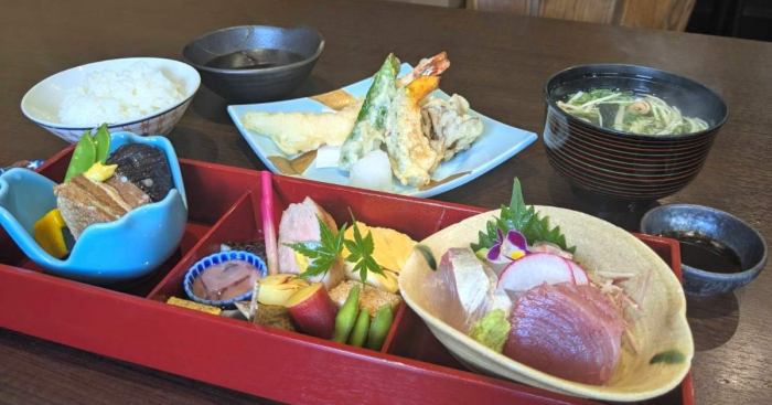 「三切り御膳」が運ばれてくると想像以上の豊富な品数とボリュームに圧倒されました!ラインナップは「お造り・八寸盛り・炊き合わせ・天ぷら・ご飯・味噌汁・香の物」です。