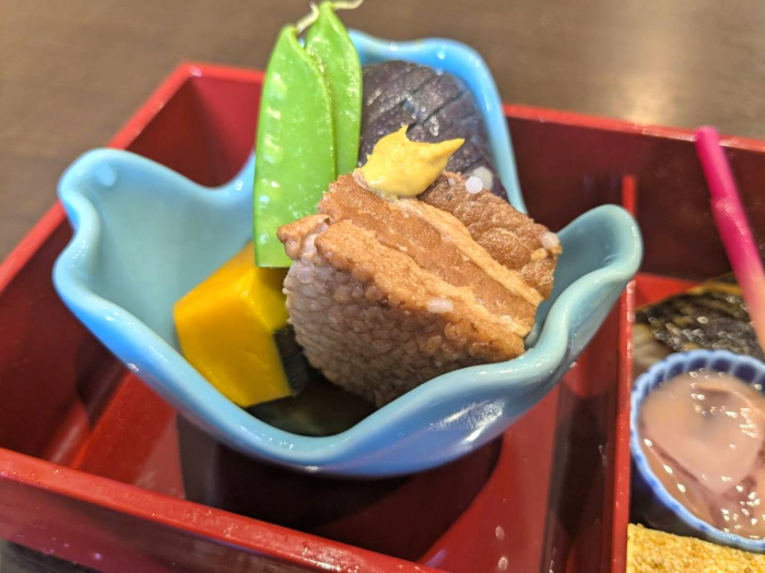 こちらは季節によって変わる「小鉢」。本日は「豚となす、かぼちゃの炊き合わせ」です。なすはお出汁がひたひたのとろける食感。大きな豚肉もホロホロと崩れるほど柔らかかったです。