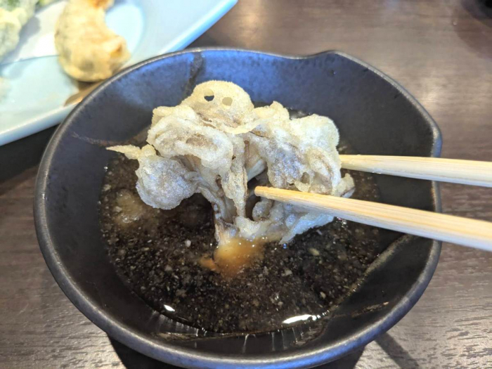 天ぷらの中で一番感動したのが「マイタケの天ぷら」。揚げたてなので衣がとにかくサクサクで、“カリカリ”と音が響き渡ります。中はとってもジューシーで、肉厚なマイタケを堪能できました。