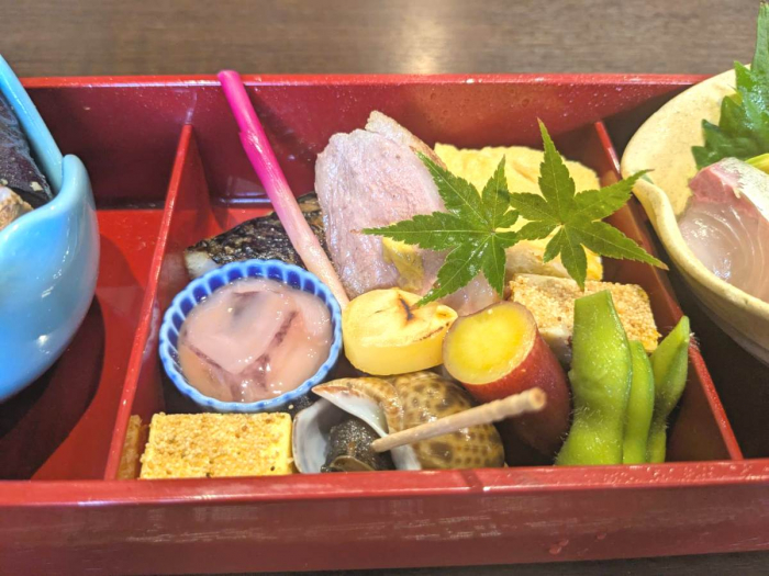 豪華な「八寸盛り」には旬の栗やさつまいもをはじめ、焼き魚、鴨、出汁巻き玉子などがぎっしり詰まっていて、どこから手をつけようか迷います。