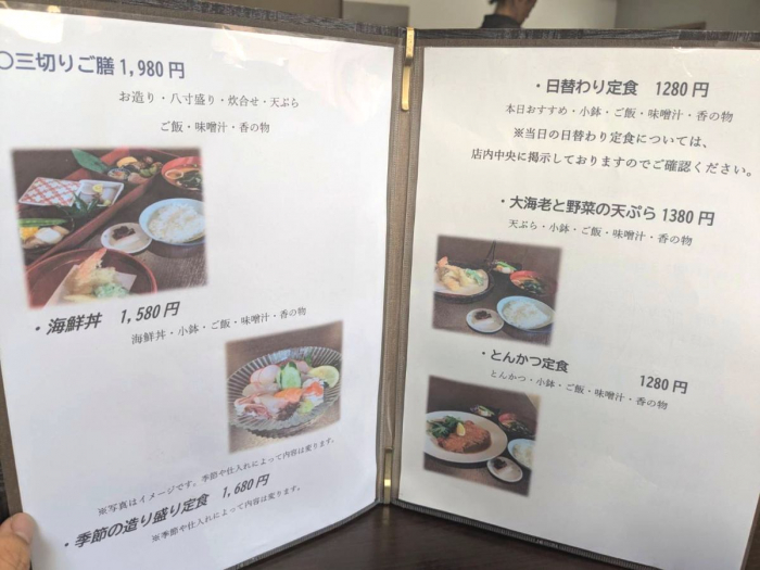 メニューは「海鮮丼」や「とんかつ定食」「日替わり定食」などたくさんあるのですが、魚が美味しいお店という口コミも多数あったので筆者は「お造り」や「八寸盛り」「天ぷら」などいろいろ楽しめる『三切り御膳』を注文しました。