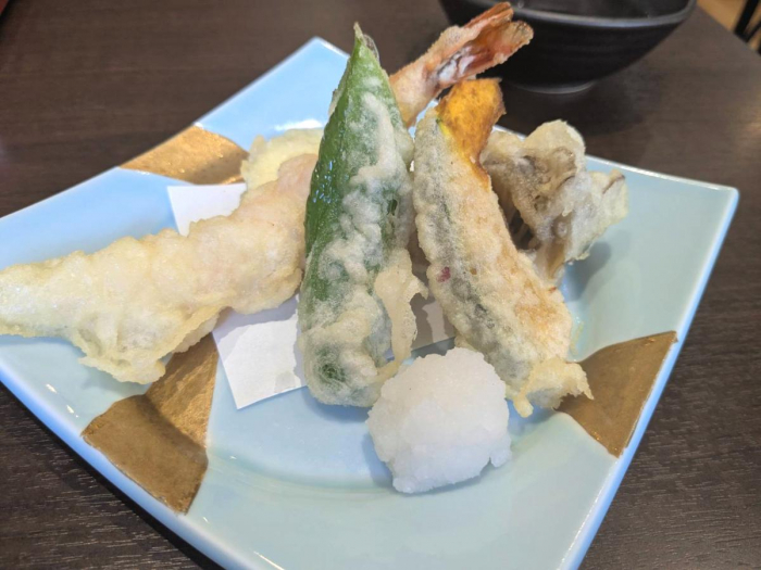 「天ぷら」は大きなエビと旬の野菜のかぼちゃやズッキーニ、マイタケなどの盛り合わせ。天つゆに大根おろしをいれていただきます。