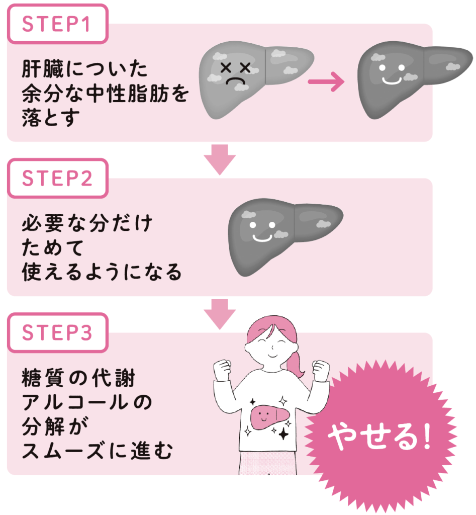 これら3つは脂肪肝になると正常に働かず、代謝機能が下がってやせにくい体に。なにをしてもやせないと悩んでいる方は、まずは自分が脂肪肝になっていないかを確認し、なっていた場合は、それを治す方法からトライしてみましょう。