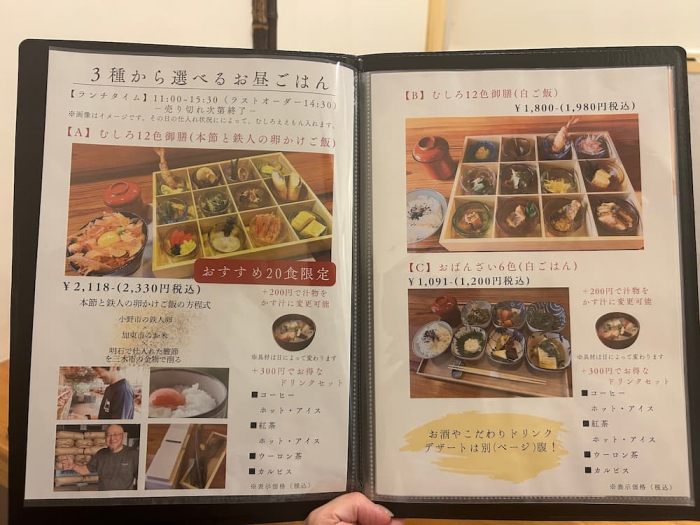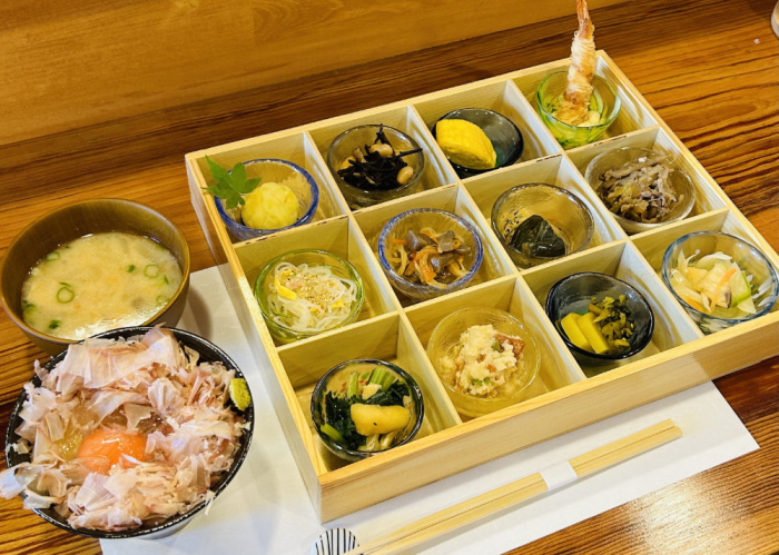 地元産コシヒカリやヒノヒカリを使った炊きたてご飯に、鹿児島・枕崎港でとれた鰹の本節と地元『小坂養鶏所』の新鮮卵を合わせた「鉄人の卵かけごはん」や、山田錦の酒粕を使用した具だくさんの「かす汁」(+200円で変更可・数量限定)と一緒にいただくと、心もお腹も大満足間違いなし。