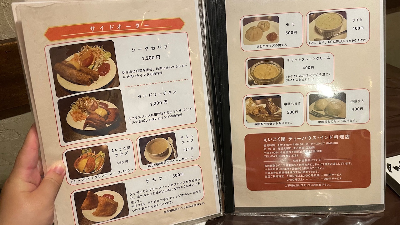 お肉料理やサモサ、モモなどのサイドメニューも美味しそうです。