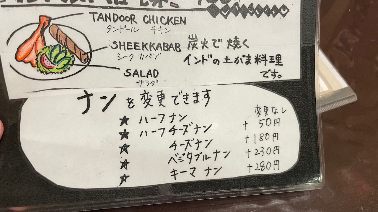 ナンが付いているセットは、ハーフナンから変更可能。定番人気のチーズナンも、ベジタブル、キーマもどんなものか気になりますね!