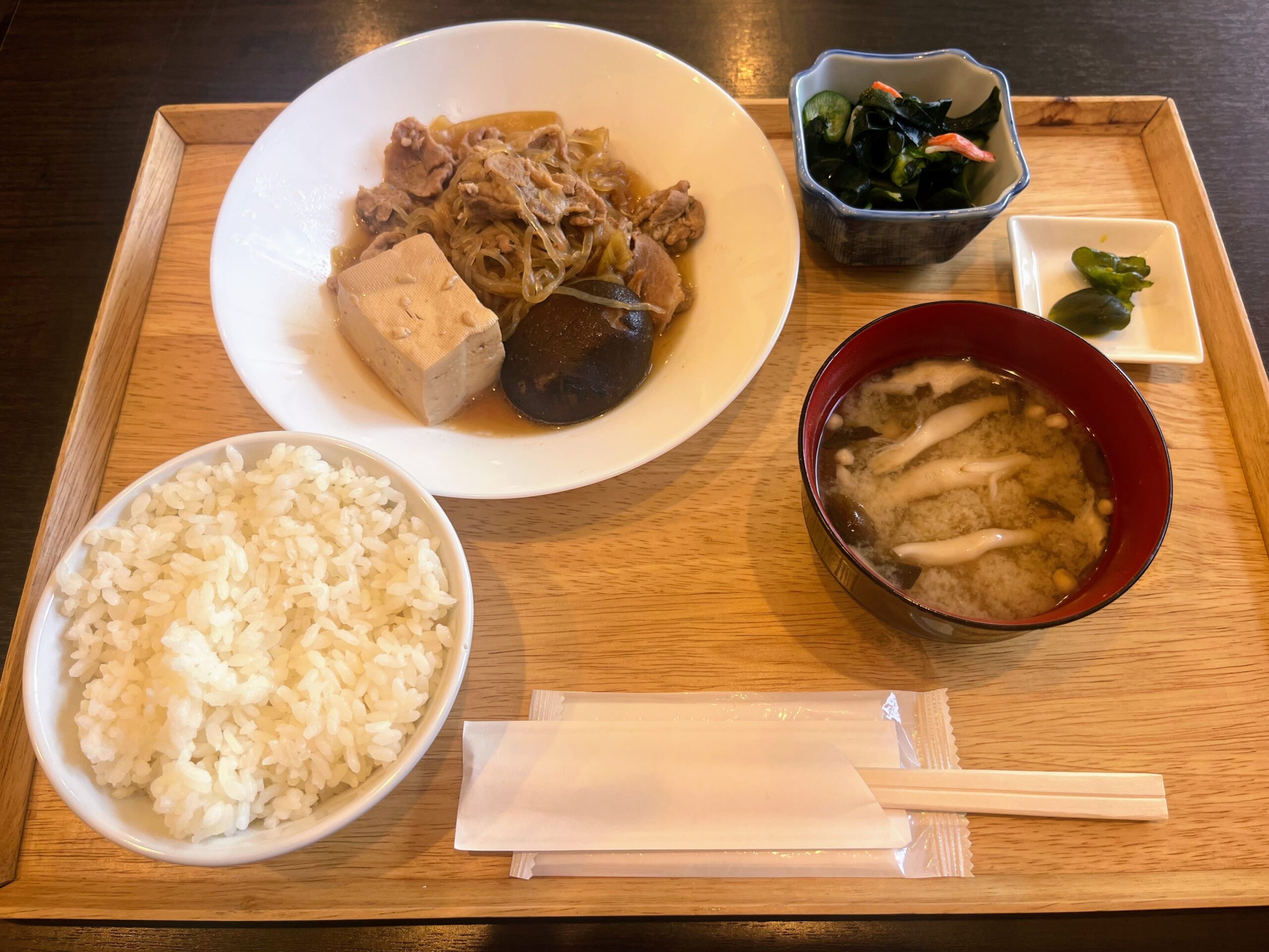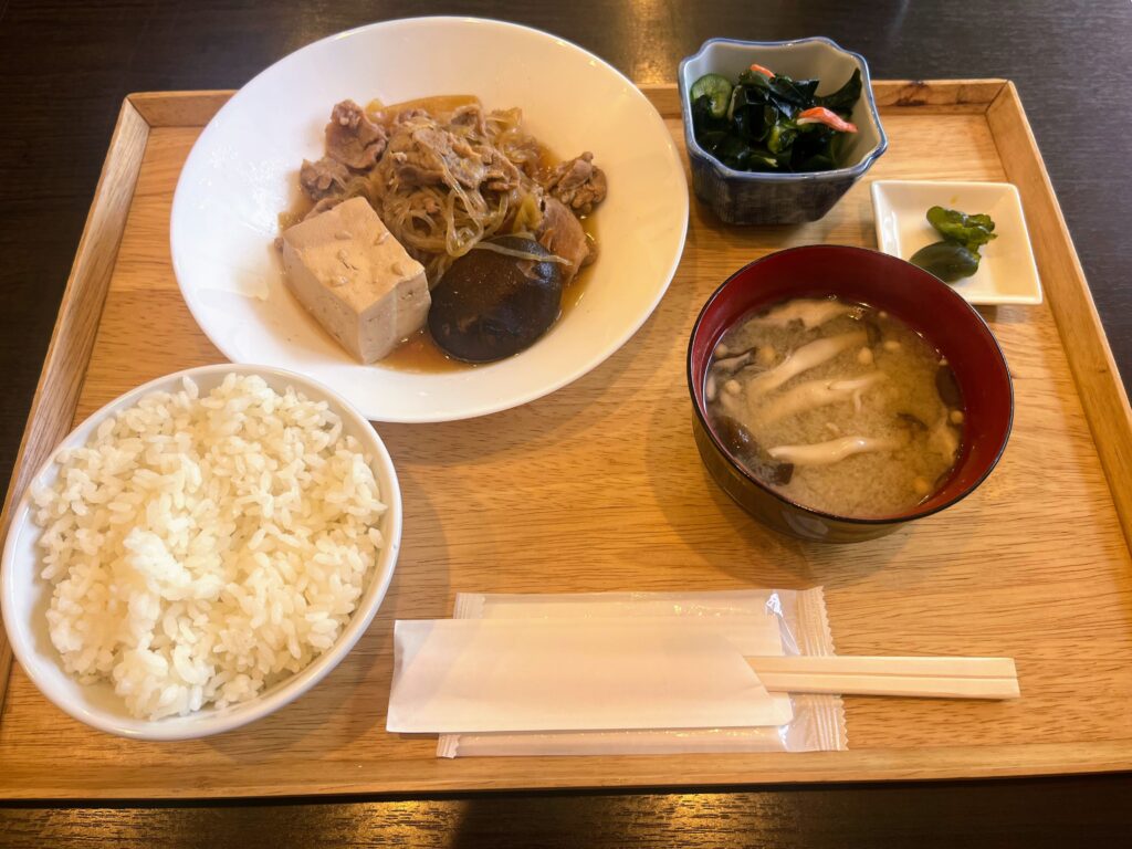 メインの肉豆腐は、お肉としらたき、大きなお豆腐と椎茸がしっかり煮込まれていて、見た目以上に食べごたえがあります。副菜には、わかめときゅうりの酢の物と、お漬物。さらに、季節感たっぷりのきのこ入りお味噌汁は、出汁がしっかりきいていて、「ホッ」とする優しい味わいでした。