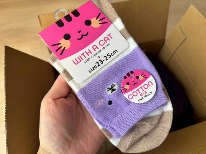 ここまで、結構大人も使用可能な感じのアイテムが続いていたが、靴下は一気にポップな雰囲気に。紫とベージュのカラフルな色使い。