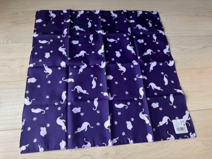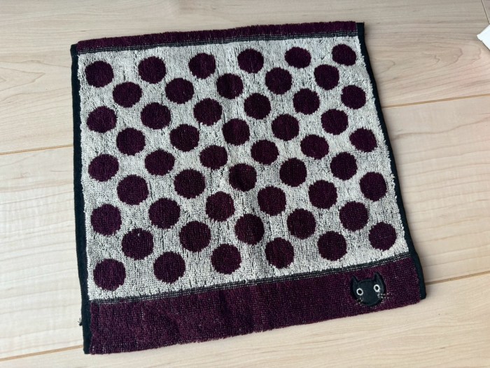 よく見るとワンポイントの黒猫がつぶらな瞳でこちらを見ている。主張が強すぎないデザインで普段使いのハンカチとして活躍してくれそう。