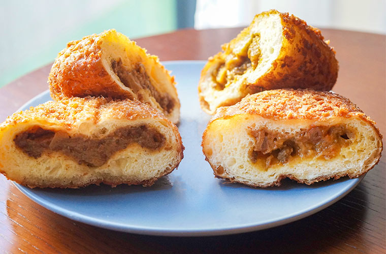 あっさりしながらも深みのある味わいの『カレーパン』。一方で、『牛すじカレーパン』にはすじ肉がゴロゴロと入っていて、食べ応え抜群です。どちらも辛さ控えめなので小さな子どもも喜びそう。その日の気分に合わせてチョイスしてみては?