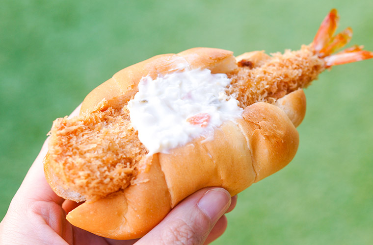 充実したおかず系パンの中でもオススメなのが『エビフライサンド』。サクサクの衣に包まれたプリプリのエビがまるごと1本入り、上にはたっぷりのタルタルソースをオン。ほんのり甘いパンとソースのコク、エビのうま味が重なり、一口食べると手が止まらなくなるおいしさです。