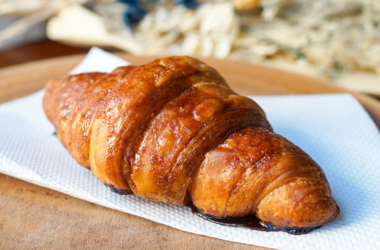 サクサクに焼き上げたクロワッサンの表面を、香ばしいキャラメルでコーティングした『クロワッサン(塩キャラメル)』。一口かじると、バターの風味とキャラメルのとろけるような甘さの虜(とりこ)になること間違いなし!ほどよい塩気が全体を引き締め、甘すぎず最後まで飽きのこないおいしさです。