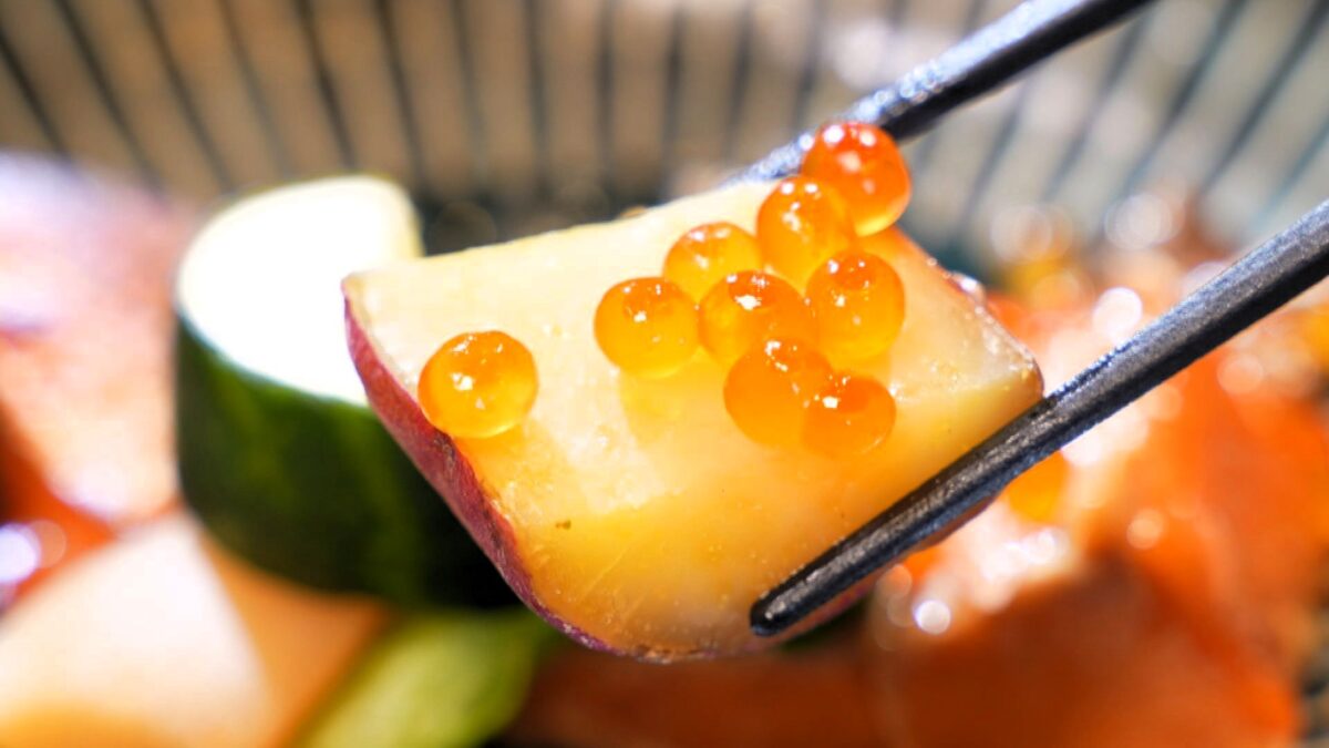 イクラの塩味がサツマイモの甘みを引き立て、プチッ・ホクッ・サクッとした食感の楽しさも味わえます。