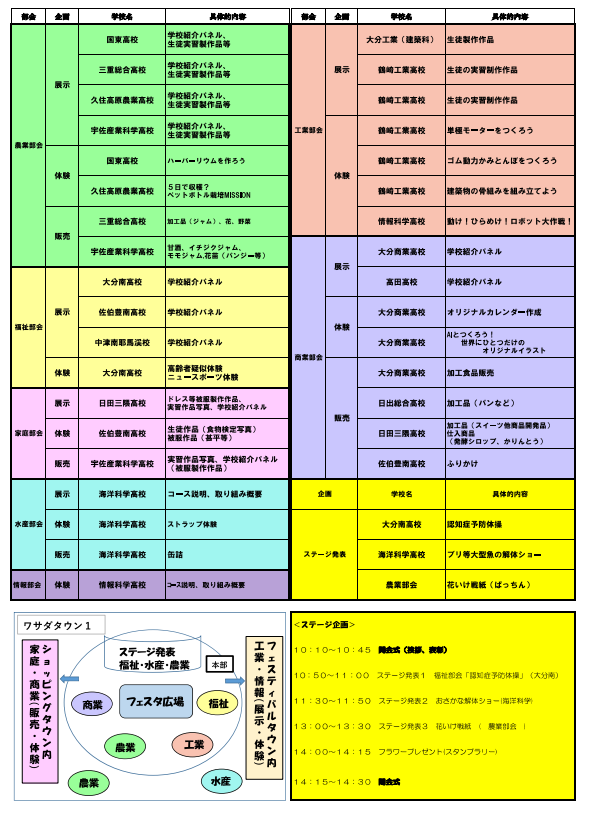 ステージ発表「認知症予防体操」「おさかな解体ショー」「花いけ戦紙(ぱっちん)」、専門教科の特色を活かした体験コーナー・展示・販売