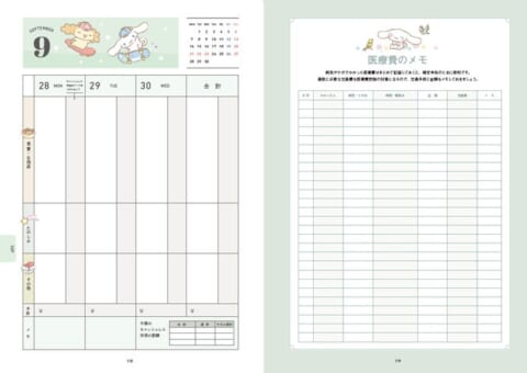 毎月、毎週、異なる表情のシナモロールたちが登場するため、ページをめくるたびに楽しさが広がります。さらに、綴じ込み付録として、キャラクターシールが98枚付属しており、家計簿をかわいらしくデコレーションすることが可能です。巻頭・巻末ページには、1年間の大きな出費をまとめる「特別支出」ページ、医療費のメモ、年間収支のまとめなど、家計管理をサポートする役立つコンテンツが充実しています。