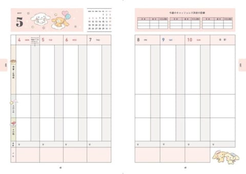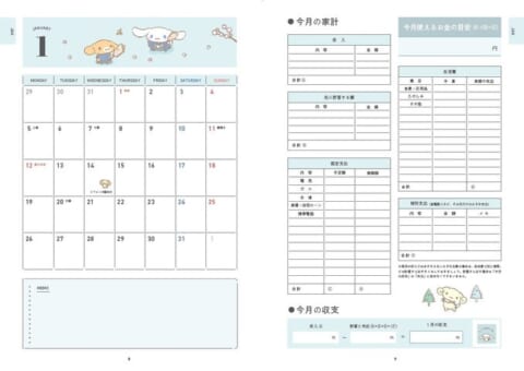 週ごとの家計簿ページに加え、1か月の収支をまとめるページが設けられています。この月ごとのまとめページに記入するだけで、その月に使えるお金の把握や、お金の流れの見える化が容易になり、家計管理能力の向上が期待できます。シナモロールのイラストがデザインされた月間カレンダーも付属しており、スケジュール管理もスムーズに行えます。