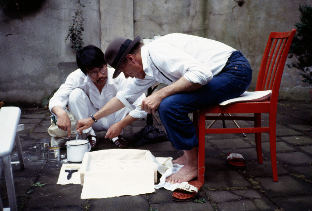 「ヨーゼフ・ボイスの足型を取る若江漢字 デュッセルドルフ、ボイスのアトリエの庭 1983年7月16日」撮影:若江栄戽