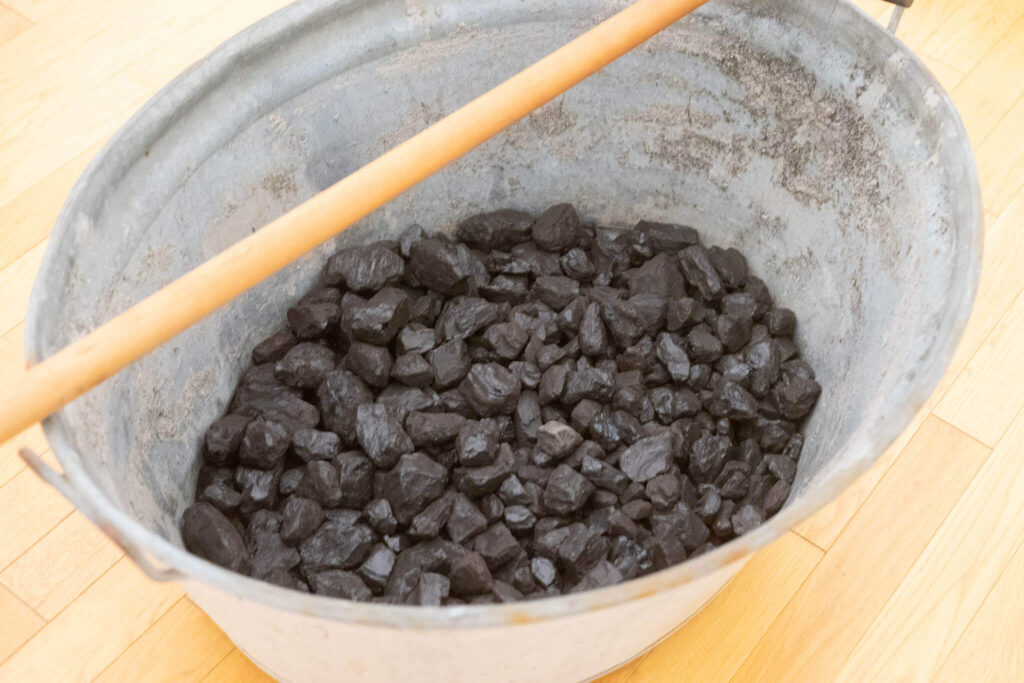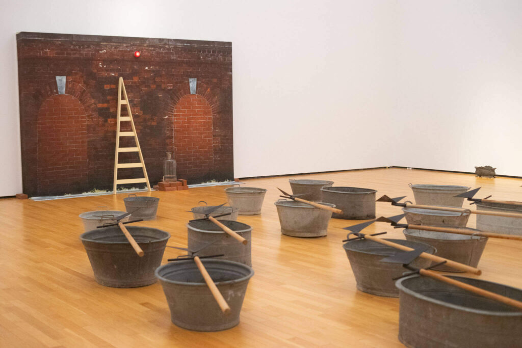 タライの中には石炭が入っており、乗せられた鋭利なスコップが揃って前を向いています。向けられた先にはふたつの閉ざされたトンネルの姿が。なんとなくぞくっとするような作品です。