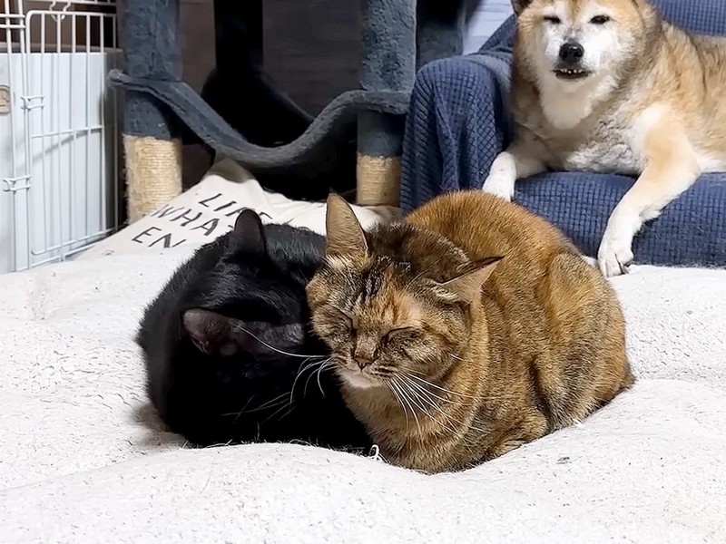 寒い朝、くっついて温まる猫たちを『見守っていた柴犬』→散歩から帰宅すると…『尊い光景』に「ぬくもりで和んでる」「団子デビュー」と反響