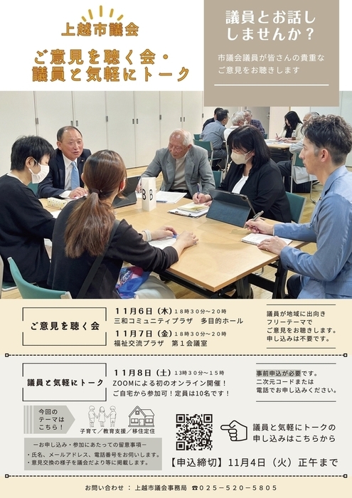 上越市議会は議員と市民が意見交換する「議員と気軽にトーク」を、2025年11月8日午後1時30分から同3時までオンラインで開催する。議員と気軽にトークは2023年度から年2回開催しているが、オンライン開催は初めて。